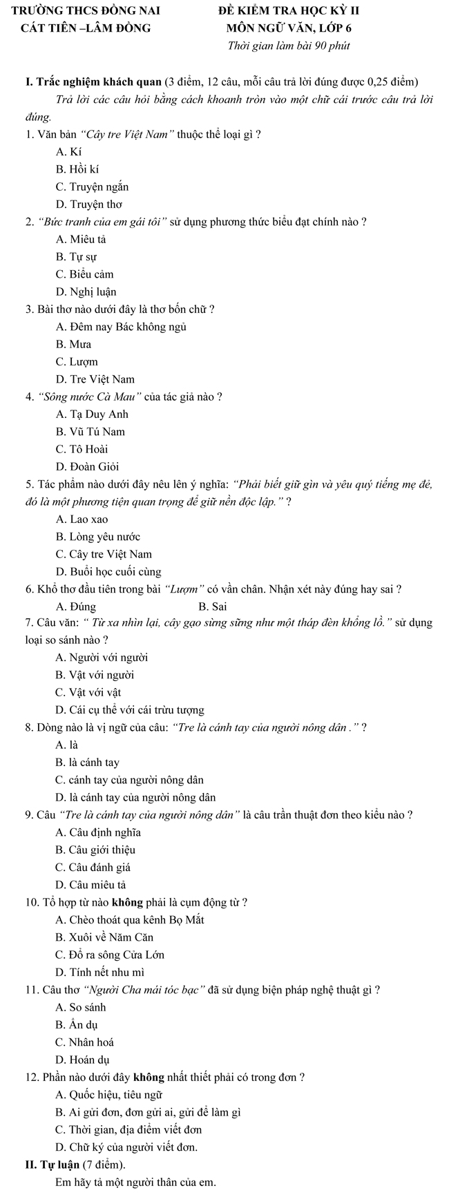 Đề kiểm tra học kì II lớp 6 môn Ngữ văn trường THCS Đồng Nai, Cát Tiên - tỉnh Lâm Đồng