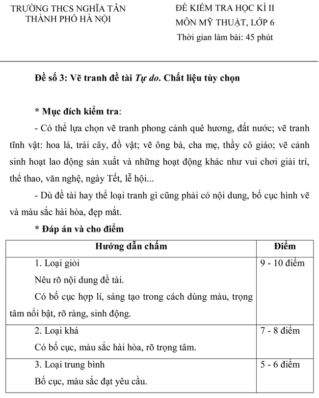 Đề kiểm tra học kì II trường THCS Nghĩa Tân môn Mỹ thuật lớp 6 - Đề số 7