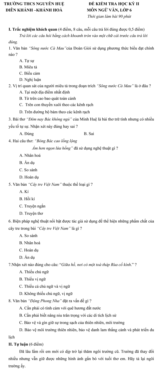 Đề kiểm tra học kì II lớp 6 môn Ngữ văn trường THCS Nguyễn Huệ, Diên Khánh tỉnh Khánh Hòa