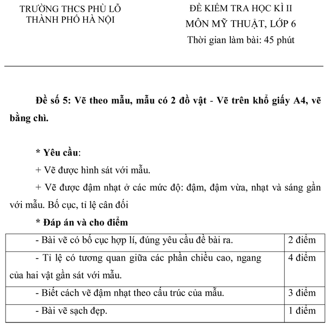 Đề kiểm tra học kì II trường THCS Phù Lỗ môn Mỹ thuật lớp 6 - Đề số 5