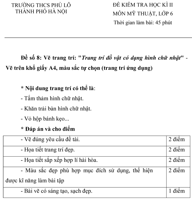 Đề kiểm tra học kì II trường THCS Phù Lỗ môn Mỹ thuật lớp 6 - Đề số 8