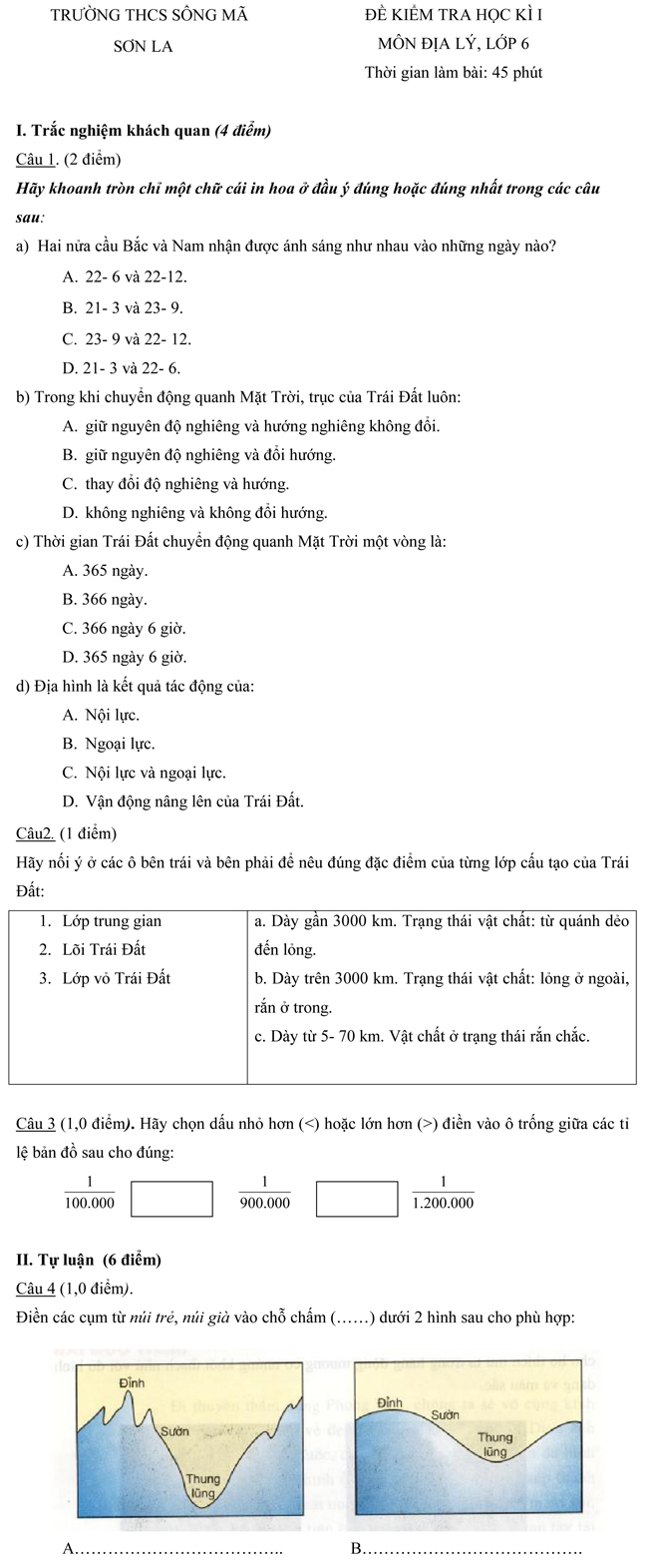 Đề kiểm tra học kỳ I môn Địa lí lớp 6 - Tỉnh Sơn La