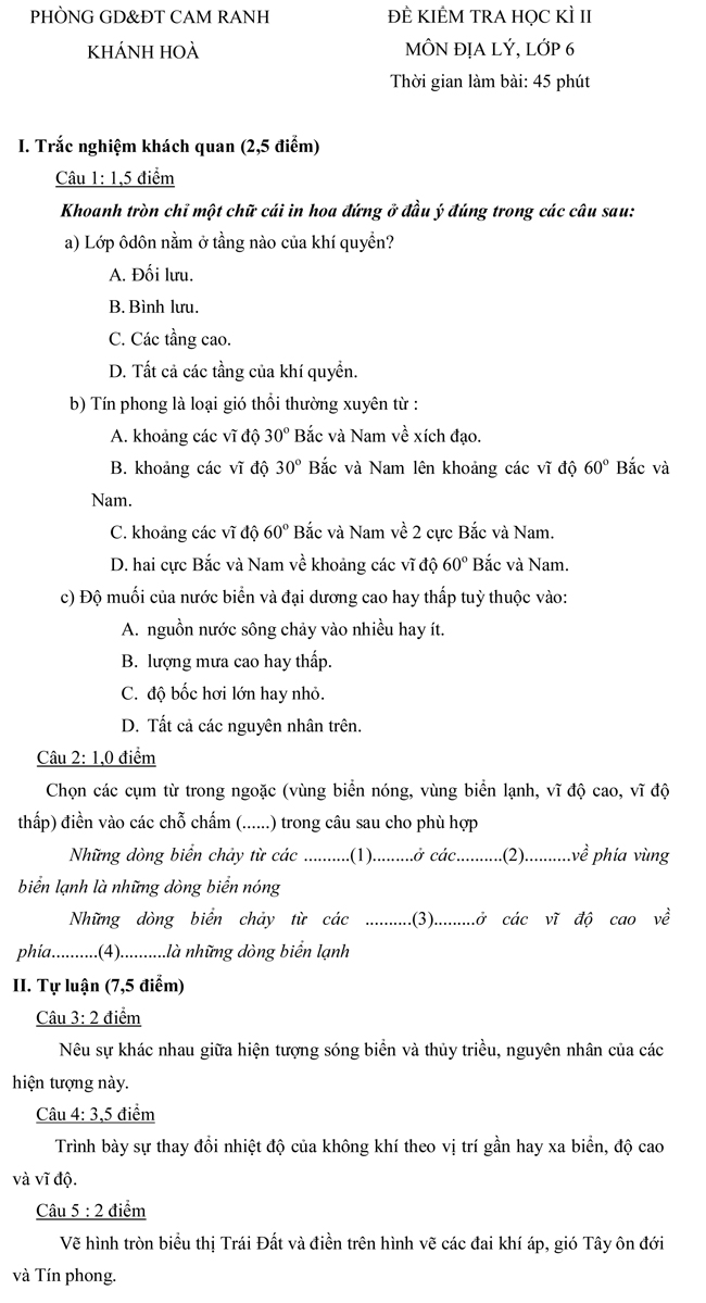 Đề kiểm tra học kỳ II môn Địa lí dành cho học sinh lớp 6 của phòng GD và ĐT Cam Ranh - Khánh Hòa