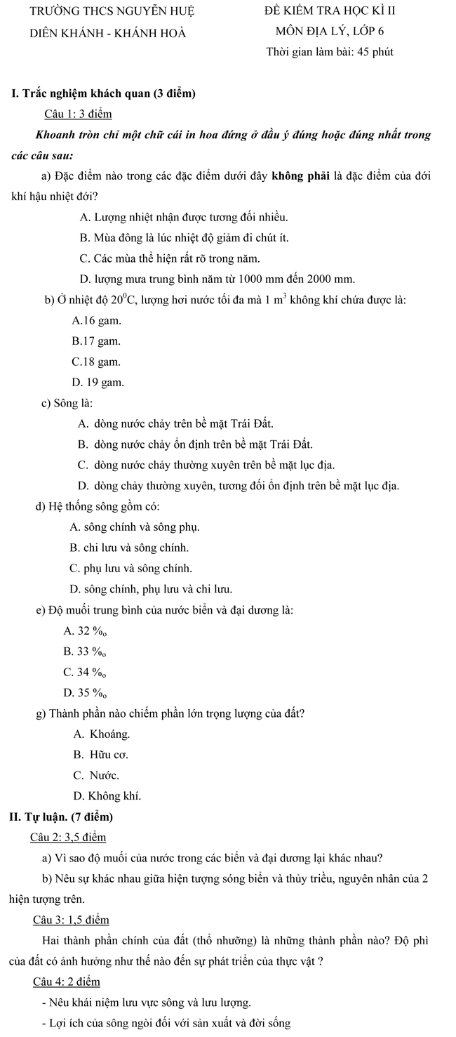 Đề kiểm tra học kỳ II môn Địa lí dành cho học sinh lớp 6 của trường THCS Nguyễn Huệ - Diên Khánh, tỉnh Khánh Hòa