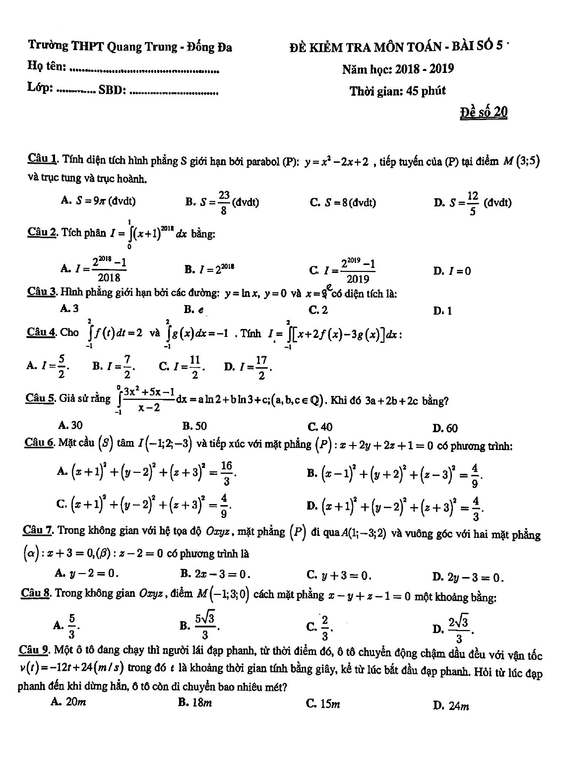 Đề kiểm tra 1 tiết lớp 12 môn Toán bài số 5 năm 2018 - 2019 trường THPT Quang Trung - Hà Nội