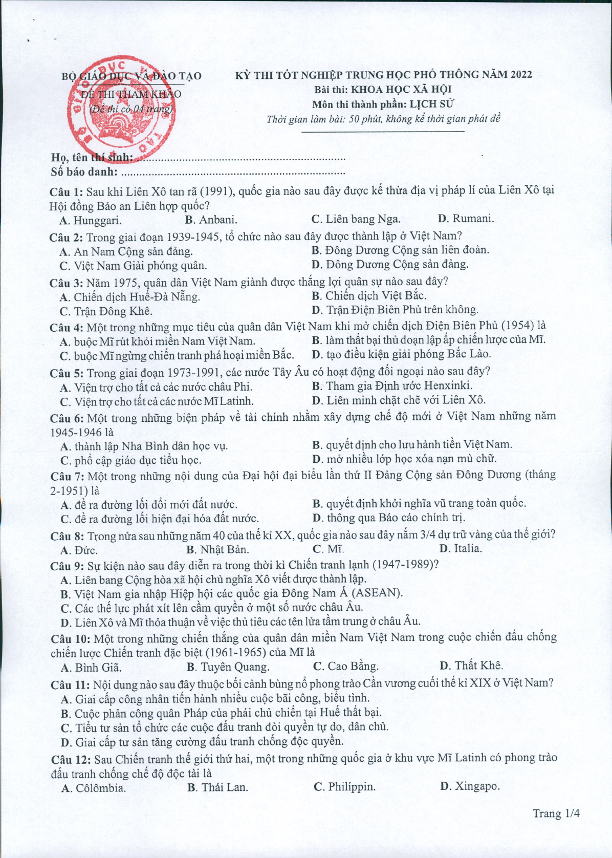 Đề minh họa 2022 môn Lịch sử được biên soạn theo cấu trúc đề thi trắc nghiệm. Đề thi được tổng hợp gồm có 4 trang với 40 câu hỏi trắc nghiệm, thí sinh làm bài trong thời gian 50 phút. Đề có đáp án và lời giải chi tiết kèm theo. Đề thi được tóm tắt nội dung trong chương trình học lớp 12.