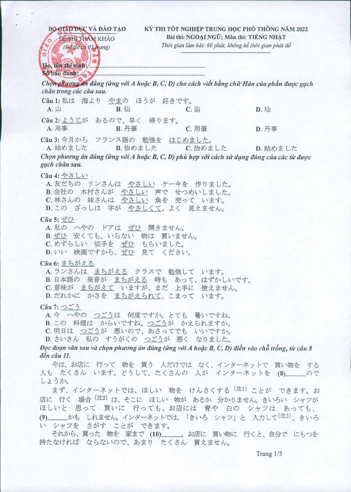 Đề minh họa thi THPT Quốc gia 2022 môn Tiếng Nhật