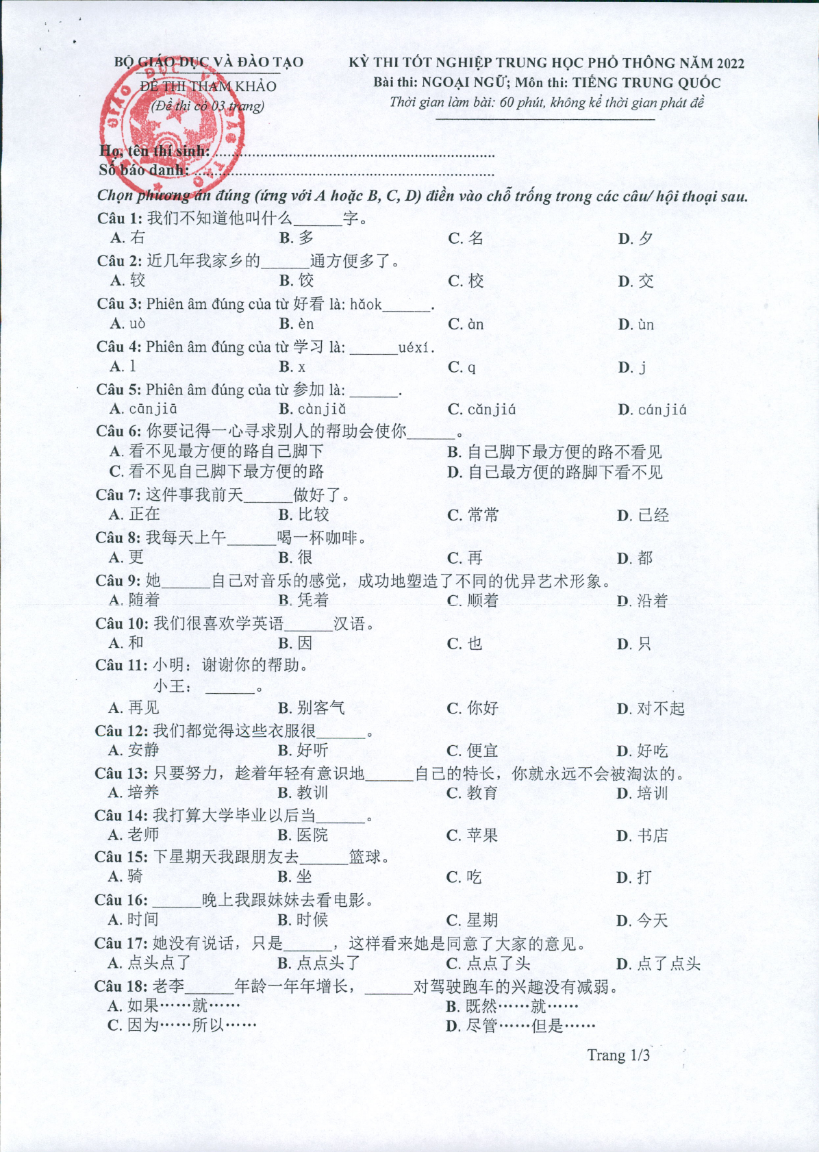 Đề minh họa 2022 môn Tiếng Trung