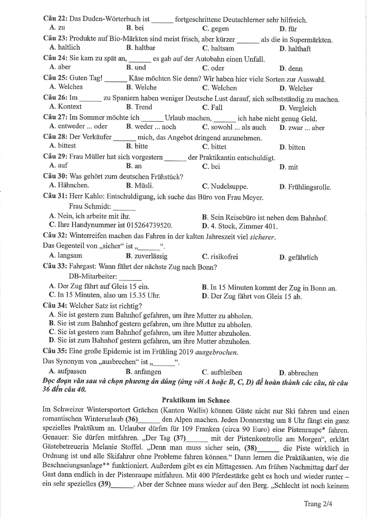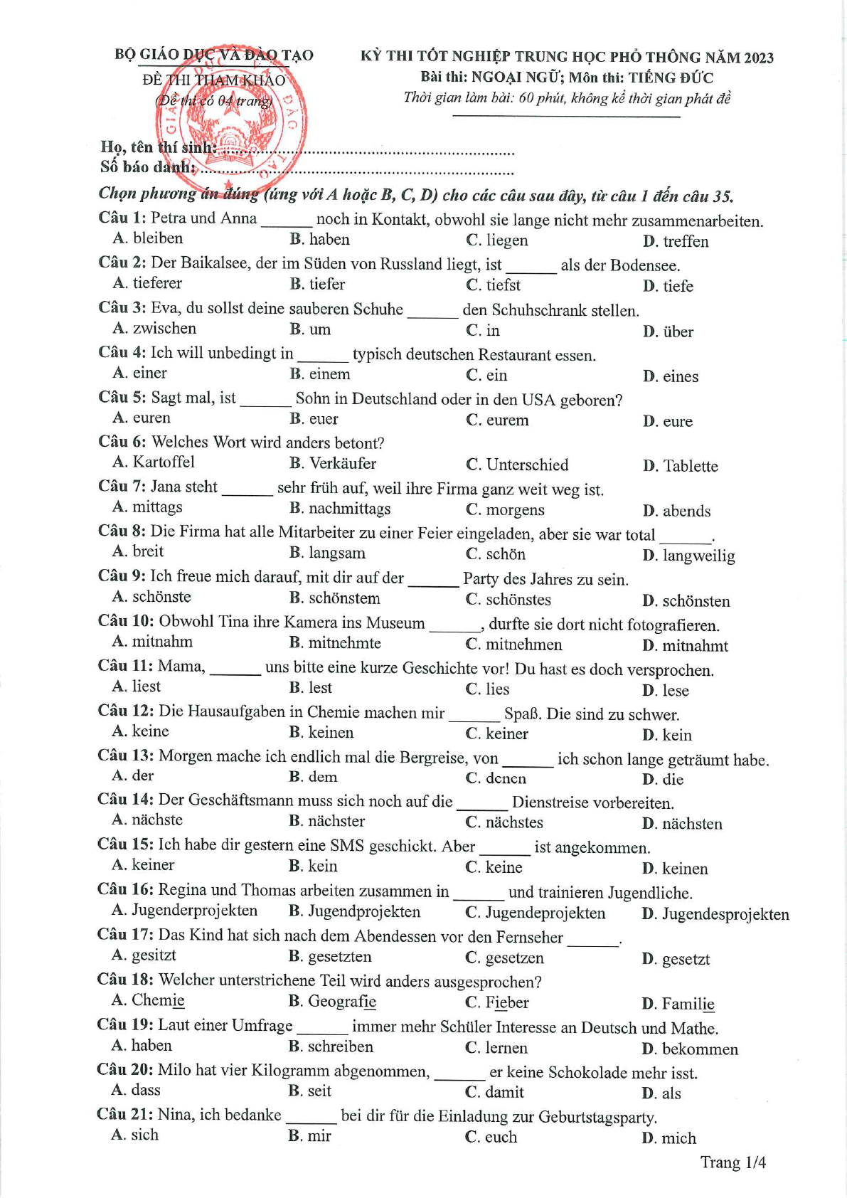 Đề minh họa 2023 môn tiếng Đức