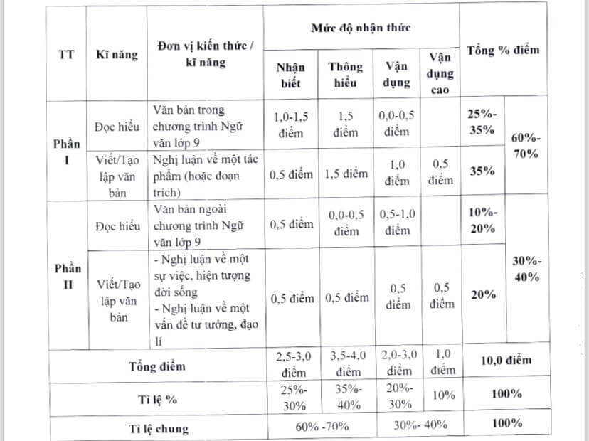 1.1 Cấu trúc bài thi tuyển sinh vào lớp 10 môn Ngữ văn