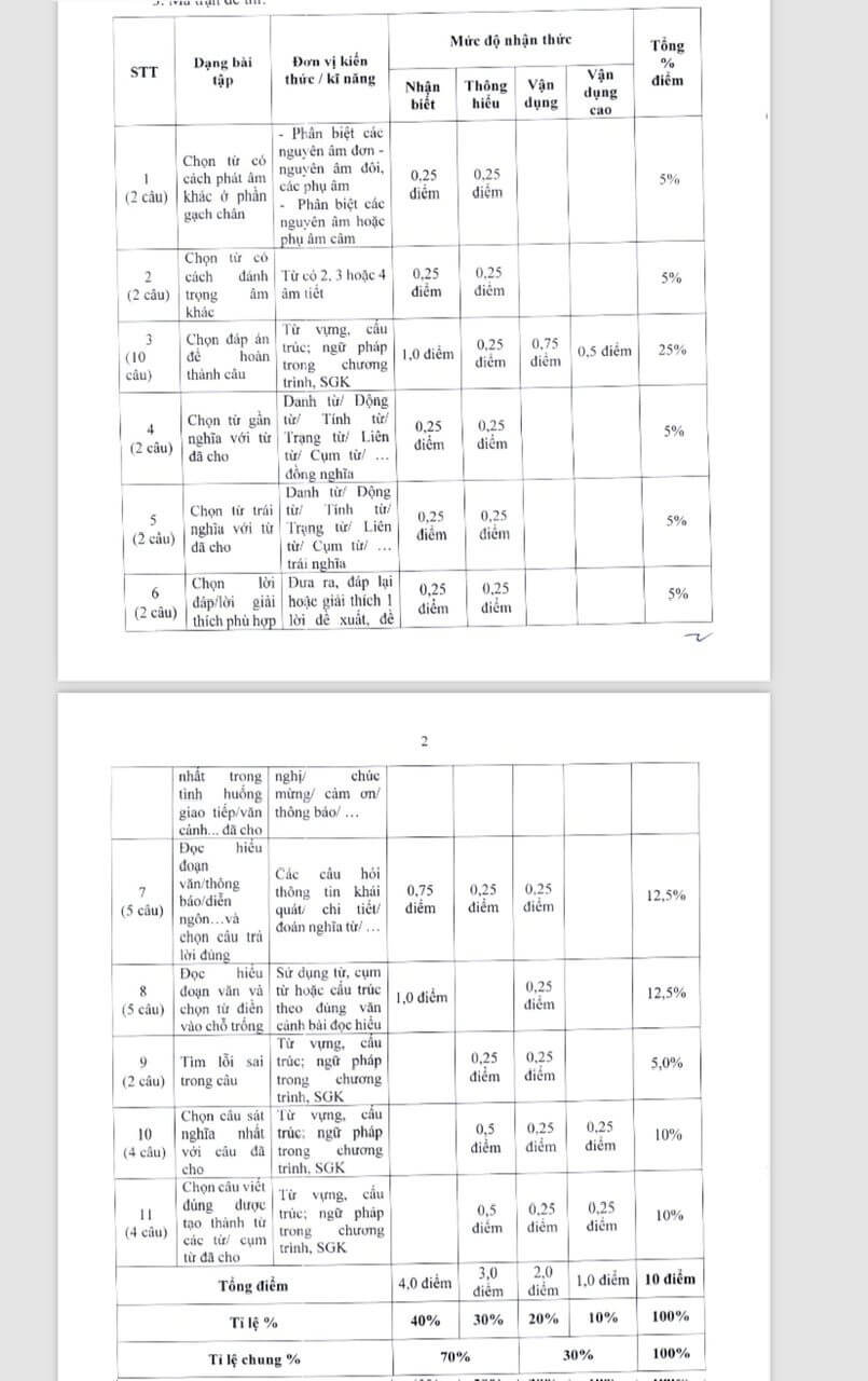 1.1 Cấu trúc bài thi tuyển sinh vào lớp 10 môn Ngoại ngữ