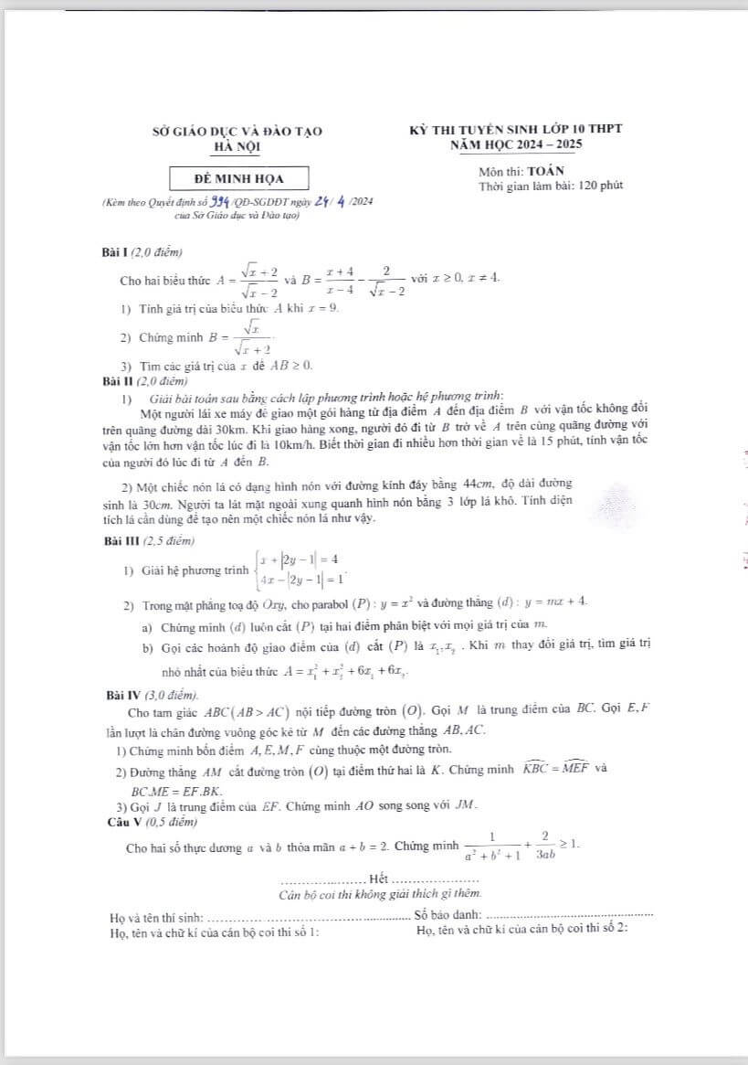Đề minh họa thi tuyển sinh vào lớp 10 Hà Nội năm học 2024 - 2025