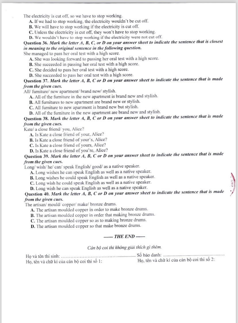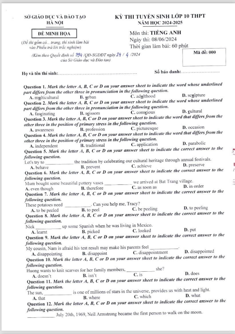 Trong đó đề thi môn ngoại ngữ theo hình thức trắc nghiệm, thời gian làm bài 60 phút; đề thi môn ngữ văn và môn toán theo hình thức tự luận, thời gian làm bài 120 phút/môn.