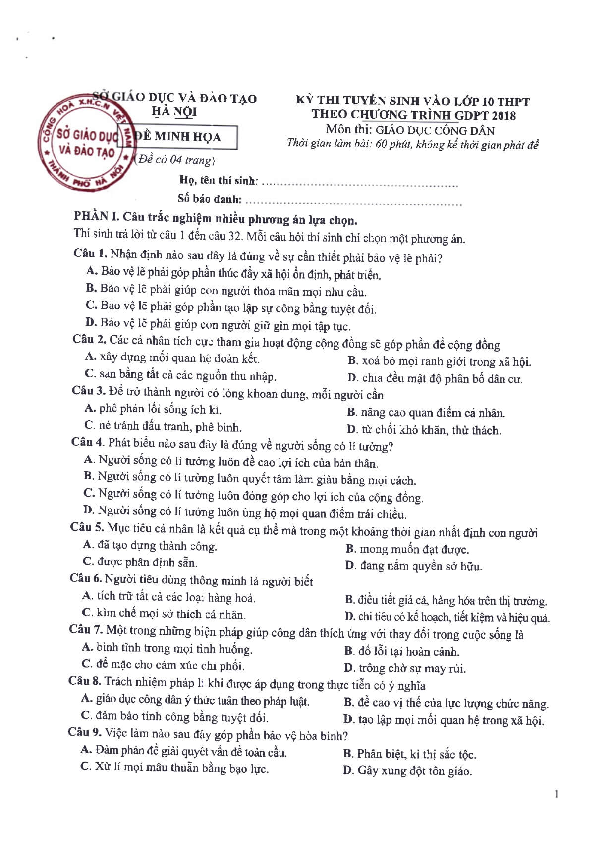 Đề minh họa thi vào 10 Hà Nội môn GDCD