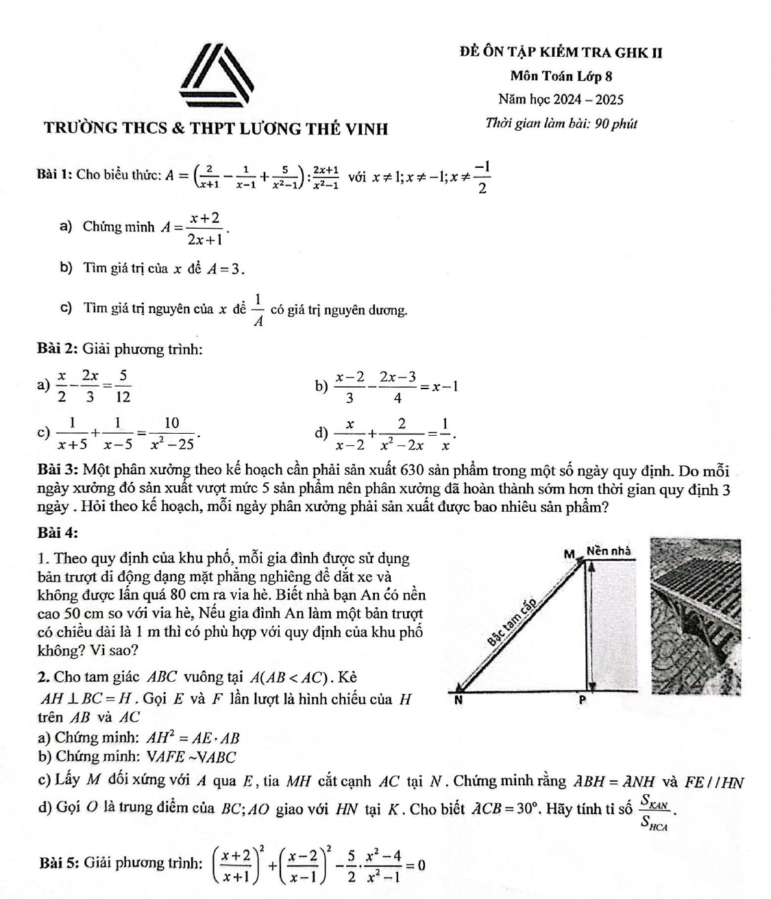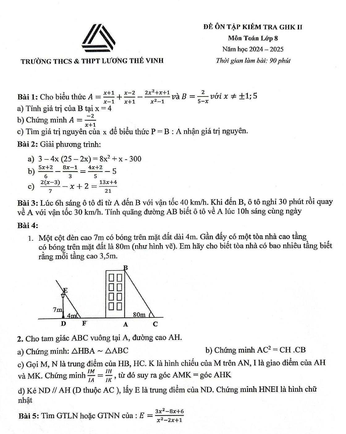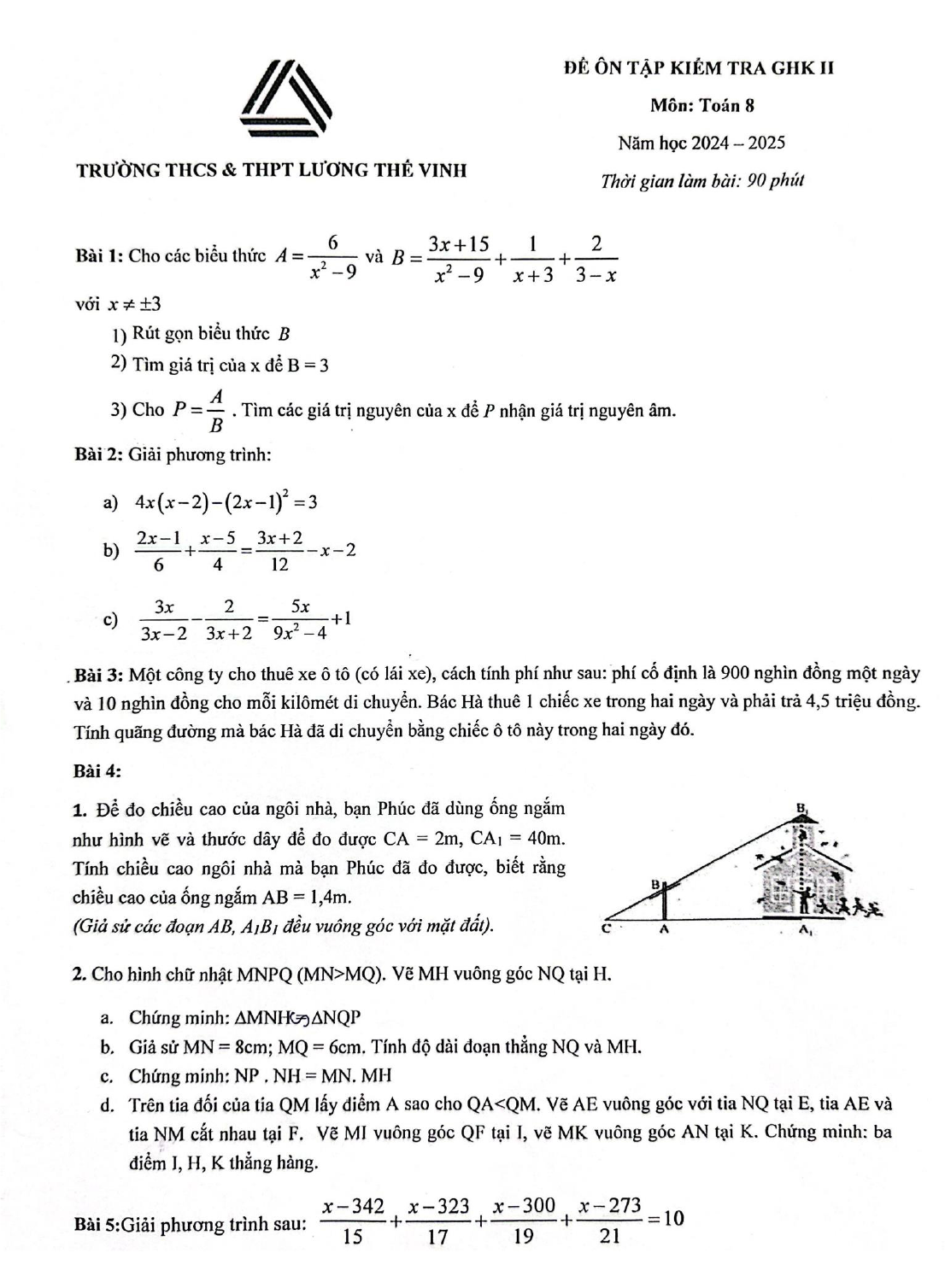 Đề ôn tập giữa kì 2 Toán 8 trường Lương Thế Vinh, Hà Nội năm 2024 - 2025