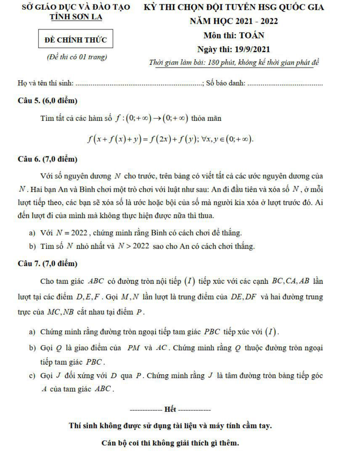 Đề thi chọn đội tuyển HSG Quốc gia môn Toán năm 2021 - 2022 tỉnh Sơn La