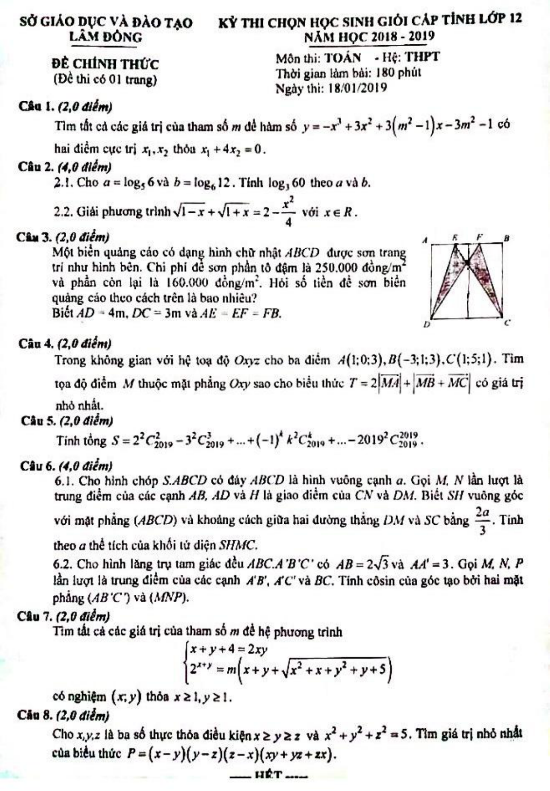 Đề thi chọn học sinh giỏi cấp tỉnh Toán 12 năm 2018 - 2019 Sở GD&ĐT Lâm Đồng