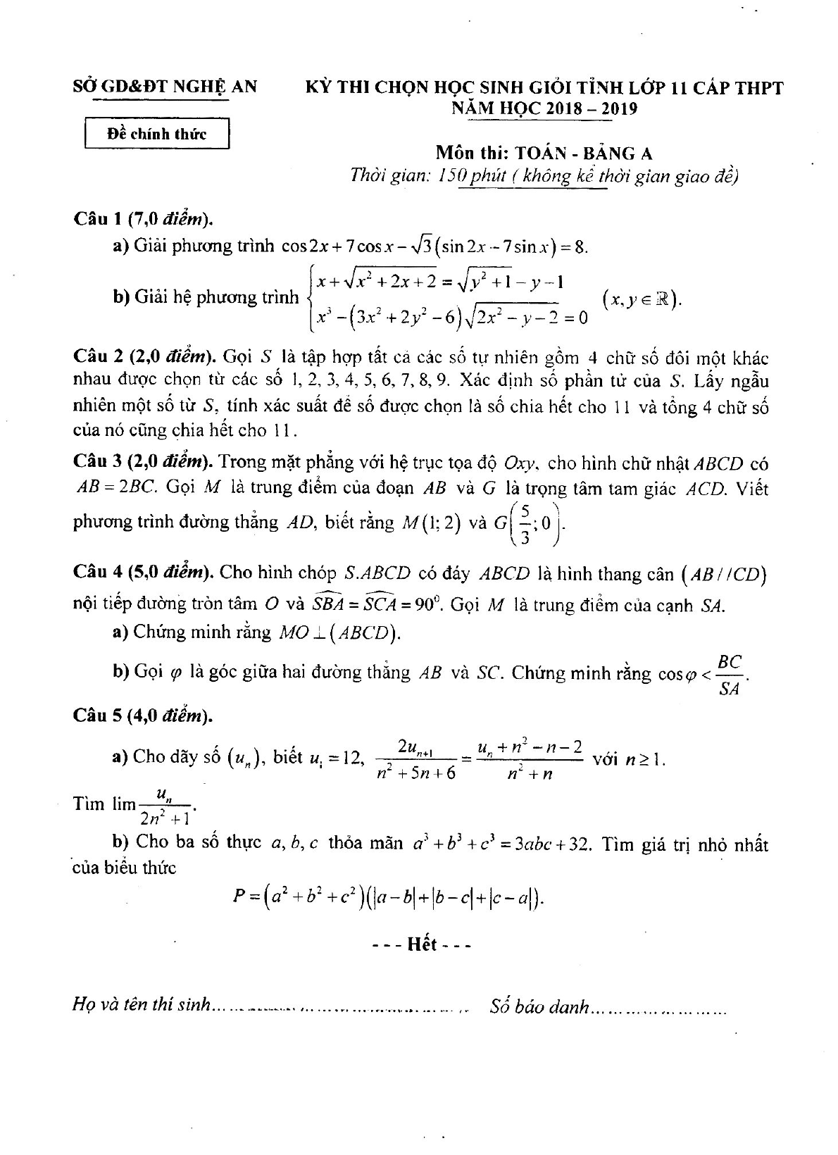 Đề thi chọn học sinh giỏi lớp 11 môn Toán cấp tỉnh năm 2018 - 2019 Sở GD&ĐT Nghệ An (Bảng A)
