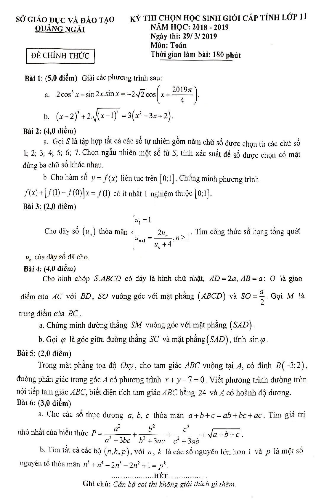 Đề thi chọn học sinh giỏi lớp 11 môn Toán cấp tỉnh năm 2018 - 2019 Sở GD&ĐT Quảng Ngãi