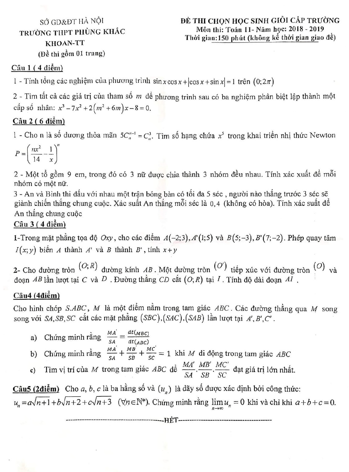 Đề thi chọn học sinh giỏi lớp 11 môn Toán năm 2018 - 2019 trường THPT Phùng Khắc Khoan - Hà Nội