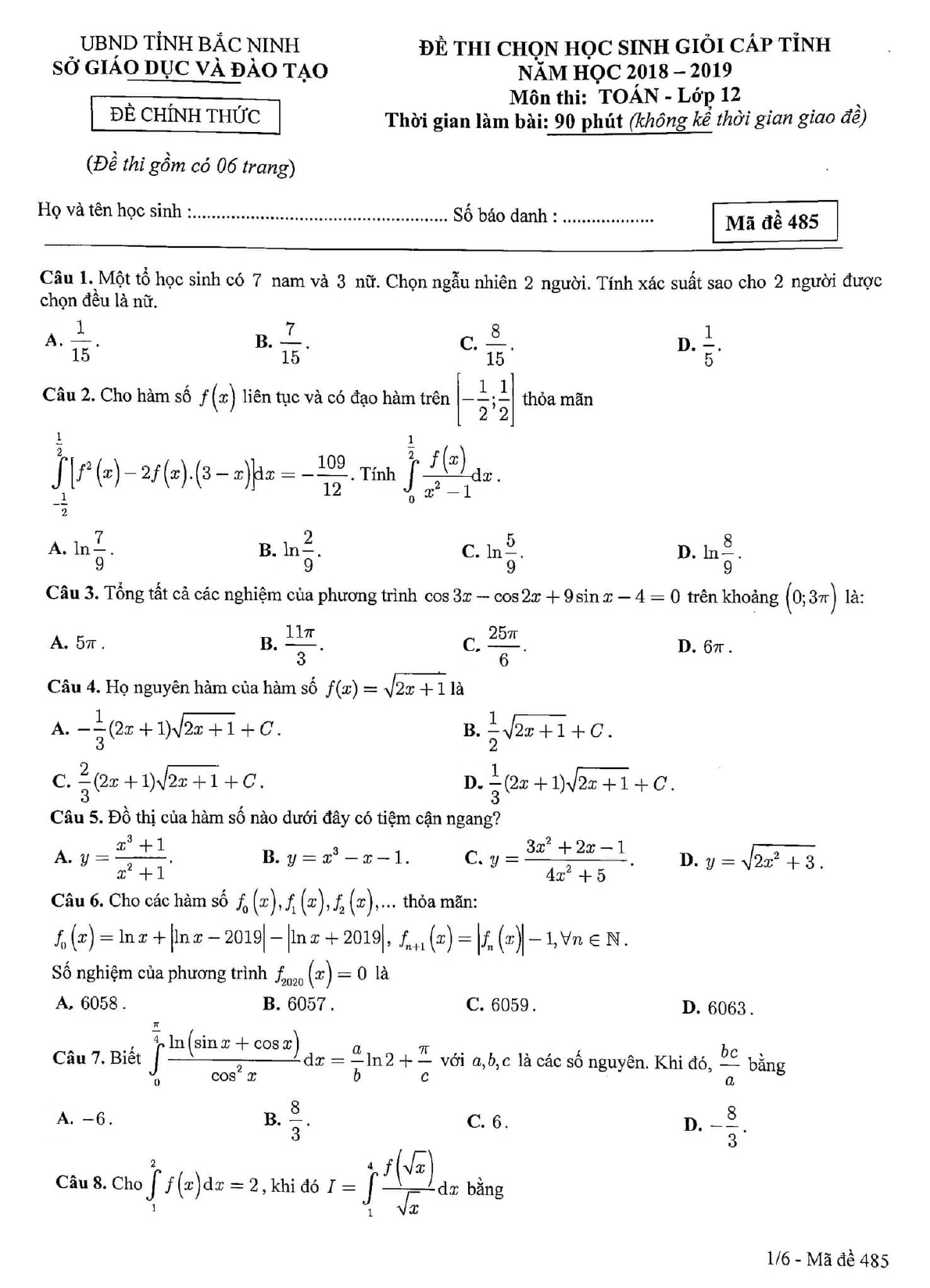 Đề thi chọn học sinh giỏi lớp 12 môn Toán cấp tỉnh năm 2018 - 2019 Sở GD&ĐT Bắc Ninh