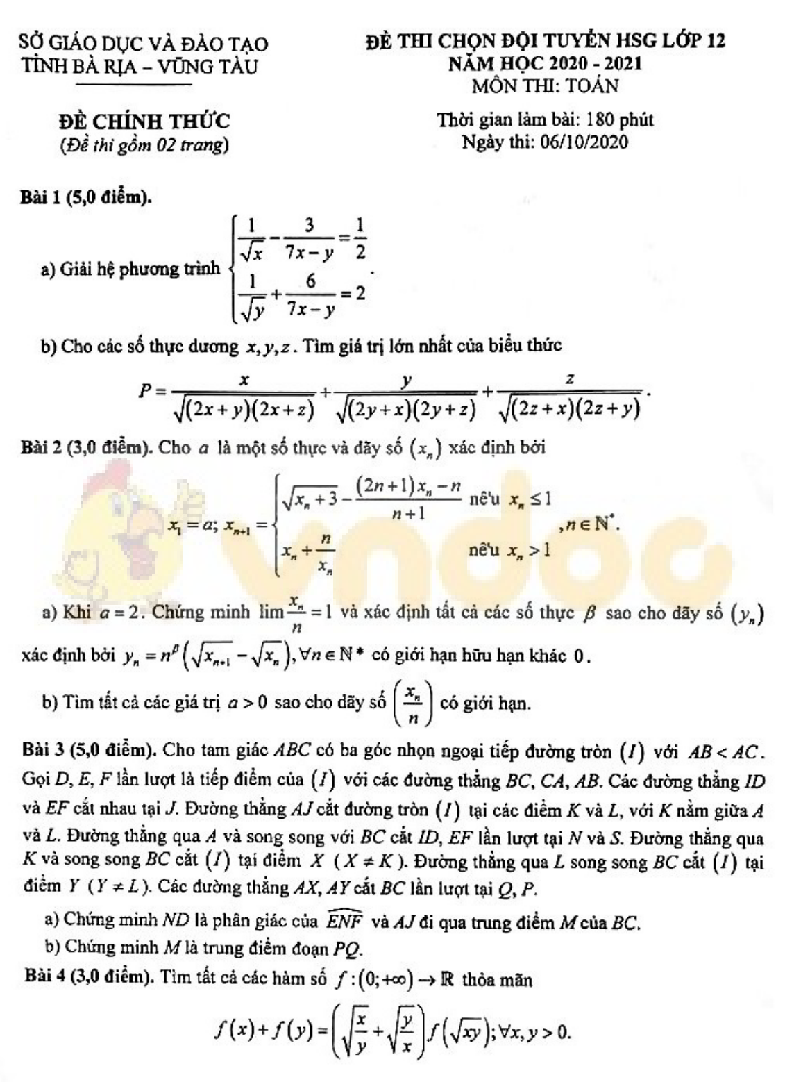 VnDoc.com xin gửi tới bạn đọc bài viết Đề thi chọn học sinh giỏi lớp 12 môn Toán năm 2020-2021 Sở GD&ĐT Bà Rịa - Vũng Tàu để bạn đọc cùng tham khảo. Bài viết được tổng hợp gồm có 5 câu hỏi tự luận, thí sinh làm bài trong thời gian 180 phút. Mời các bạn cùng tham khảo chi tiết tại đây.