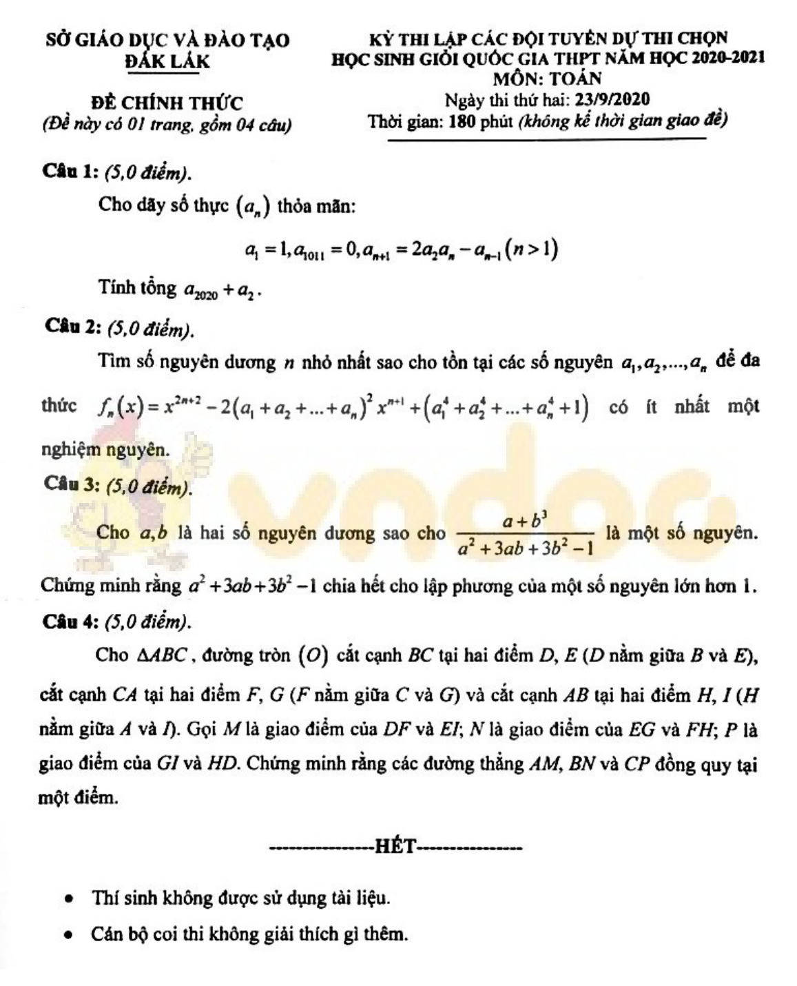 Đề thi chọn học sinh giỏi lớp 12 môn Toán năm 2020-2021 Sở GD&ĐT Đắk Lắk (ngày 2) vừa được VnDoc.com tổng hợp và xin gửi tới bạn đọc cùng tham khảo. Mong rằng qua bài viết này các bạn có thêm nhiều tài liệu học tập và ôn tập cho kì thi học sinh giỏi sắp tới nhé. Mời các bạn cùng tham khảo chi tiết và tải về tại đây.