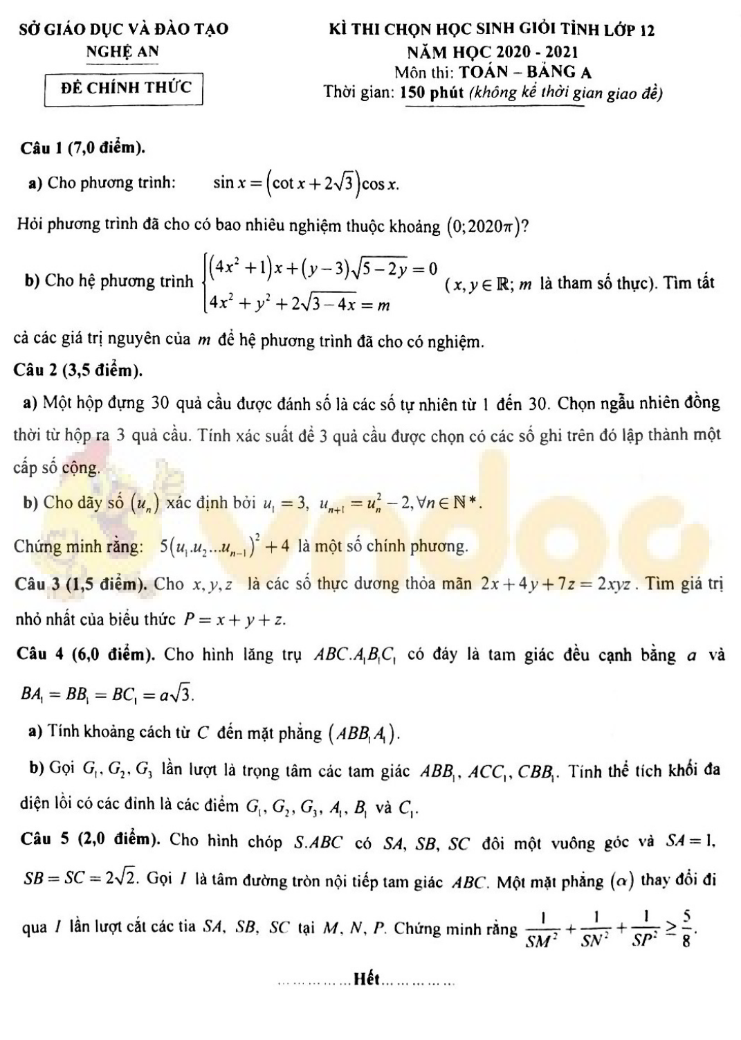 Đề thi chọn học sinh giỏi lớp 12 môn Toán năm 2020-2021 Sở GD&ĐT Nghệ An Bảng A vừa được VnDoc.com sưu tập và xin gửi tới bạn đọc cùng tham khảo. Mong rằng qua bài viết này các bạn có thêm tài liệu học tập và ôn tập cho kì thi học sinh giỏi sắp tới nhé. Mời các bạn cùng tham khảo chi tiết và tải về tại đây nhé.