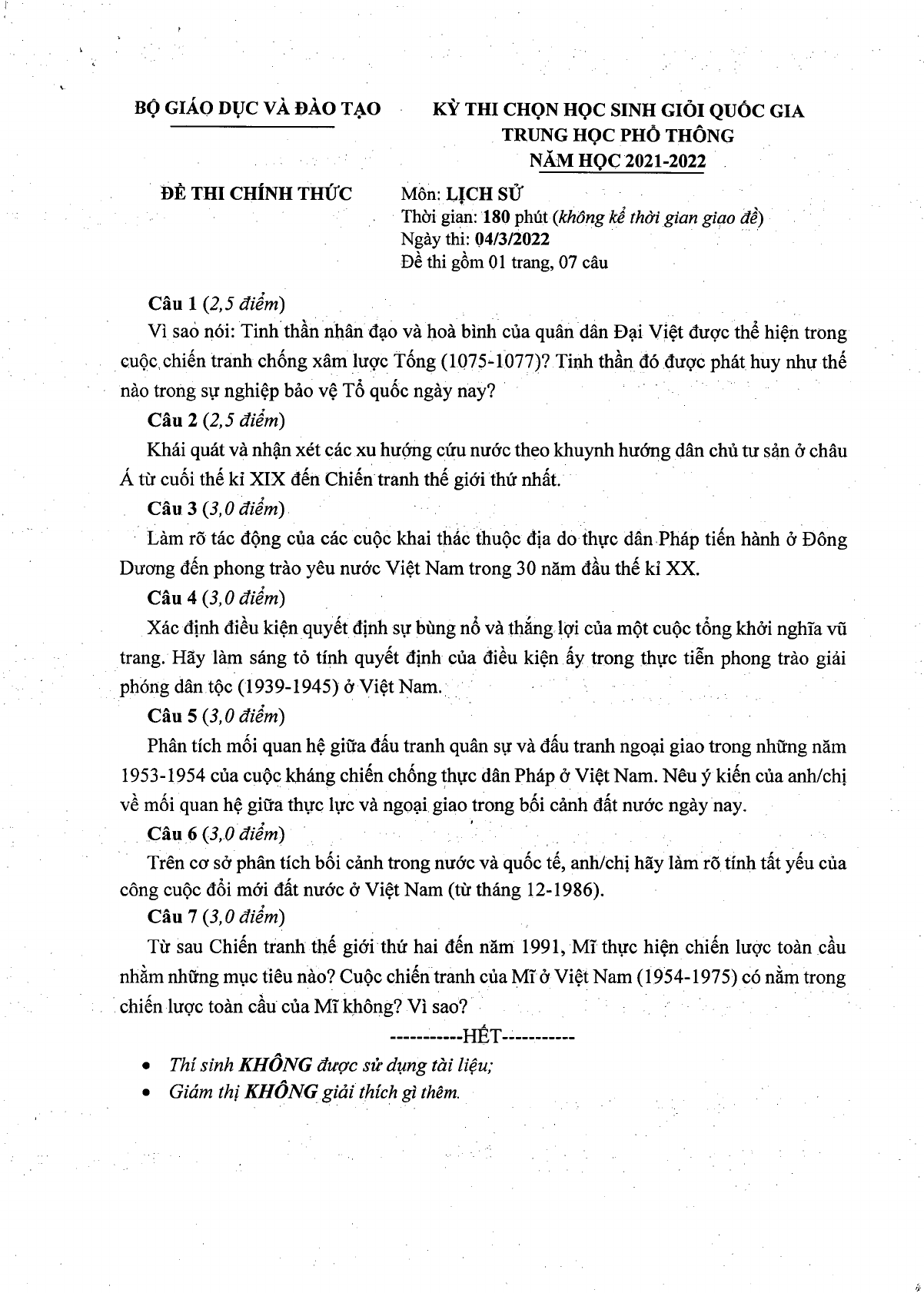Đề thi chọn HSG môn Lịch sử năm 2022