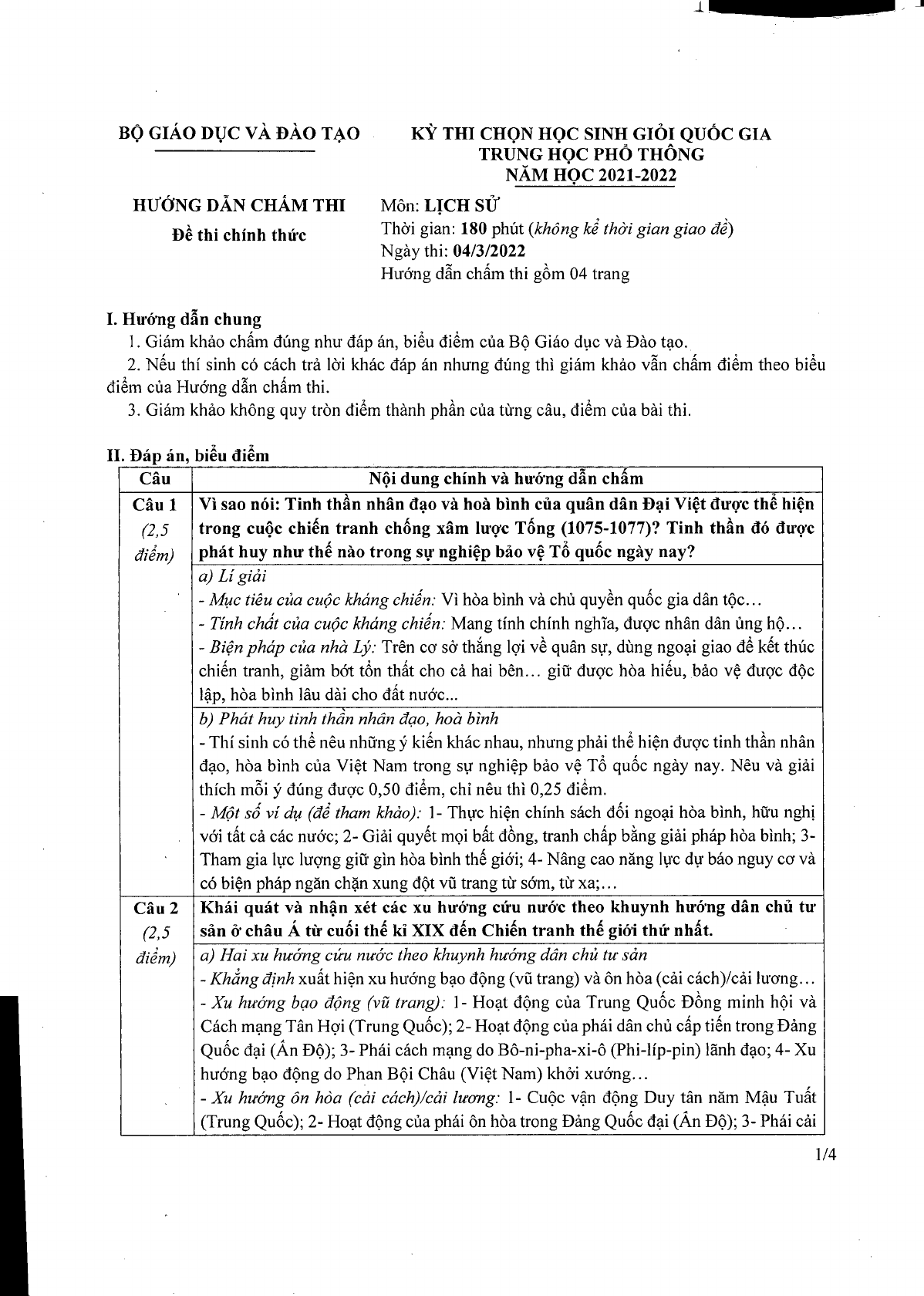 Đáp án đề thi chọn học sinh giỏi Quốc gia THPT môn Lịch sử năm 2022 Bộ GD&ĐT