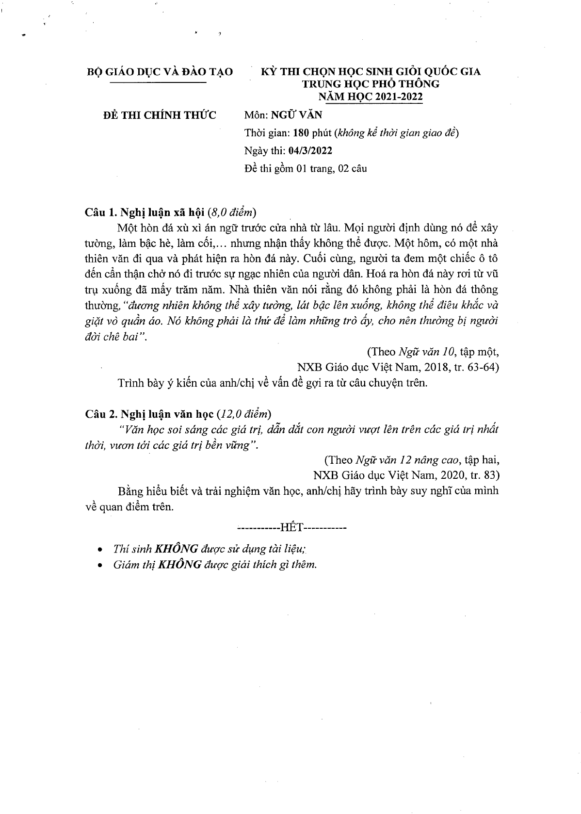 Đề thi chọn HSG Quốc gia môn Ngữ văn năm 2022