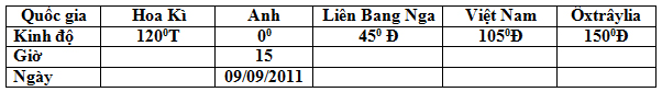 b. Khi nước Anh (kinh tuyến gốc) là 15 giờ ngày 09/09/2011 thì tương ứng mấy giờ và ngày nào tại các quốc gia thuộc kinh độ sau đây: