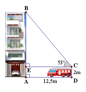 Trong một buổi diễn tập, xe cứu hoả cần dập tắt một đám cháy ở trên nóc tòa nhà (điểm B trong hình vẽ bên). Biết vị trí thang cứu hoả đặt ở điểm C; độ cao của xe CD=2m; khoảng cách từ xe đến toà nhà DA=12,5m và góc tạo bởi thang với phương song song mặt đất là