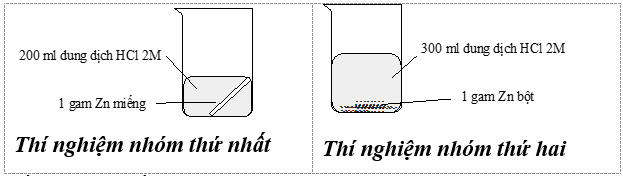 Thí nghiệm nghiên cứu tốc độ phản ứng giữa kẽm (zinc) với dung dịch hydrochloric acid của hai nhóm học sinh được mô tả bằng hình sau: