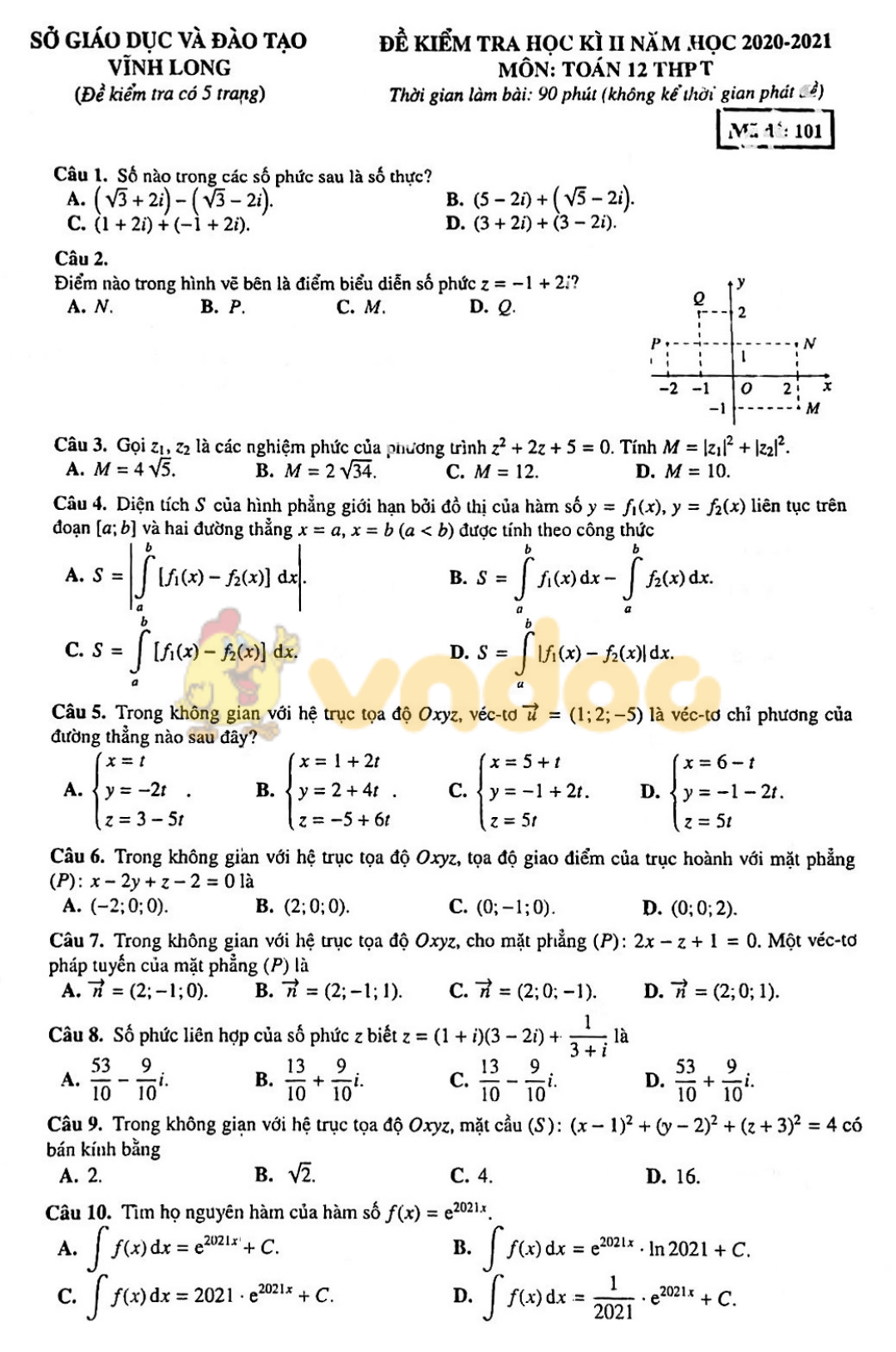 Đề thi cuối học kì 2 Toán 12 năm 2021 Sở GD&ĐT Vĩnh Long có đáp án
