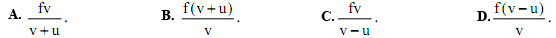 Câu 53: Trên một đường ray thẳng có một nguồn âm S đứng yên phát ra âm với tần số f và một máy thu M chuyển động ra xa S so với tốc độ u. Biết tốc độ truyền tâm là v (v > u). Tần số của âm mà máy thu nhận được là:![]()