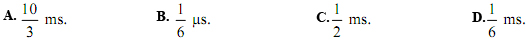 Câu 56: Mạch dao động LC lí tưởng đang hoạt động, điện tích cực đại của tụ điện là qo = 10-6C và cường độ dòng điện cực đại trong đoạn mạch là Io = 3π mA. Tính từ thời điểm điện tích trên tụ là qo, khoảng thời gian ngắn nhất để cường độ dòng điện trong mạch có độ lớn bằng Io là:![]()