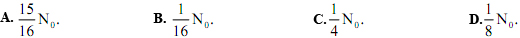 Câu 57: Ban đầu một mẫu chất phóng xạ nguyên chất có No hạt nhân. Biết chu kỳ bán rã của chất phóng xạ này là T. Sau thời gian 4T, kể từ thời điểm ban đầu, số hạt nhân chưa phân rã của mẫu chất phóng xạ này là:![]()