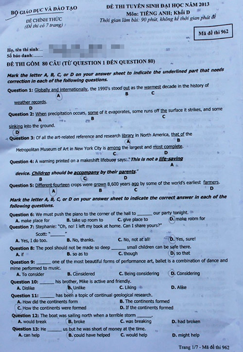 Đề thi - Đáp án thi Đại học 2013 - môn Tiếng Anh khối D: