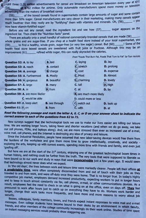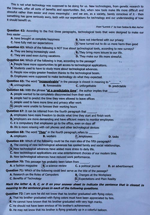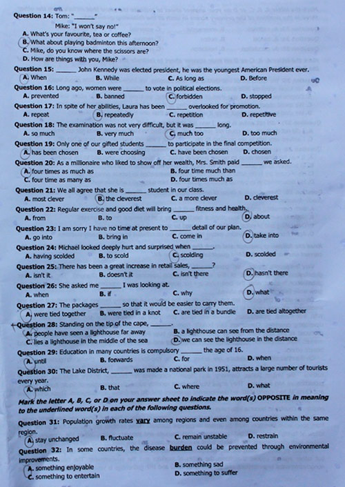 Đáp án tham khảo đề Tiếng Anh khối D mã đề 572: