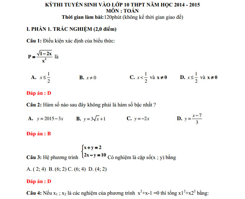 Đề thi - Đáp án thi tuyển sinh lớp 10 THPT TP Hải Phòng năm 2014 - 2015