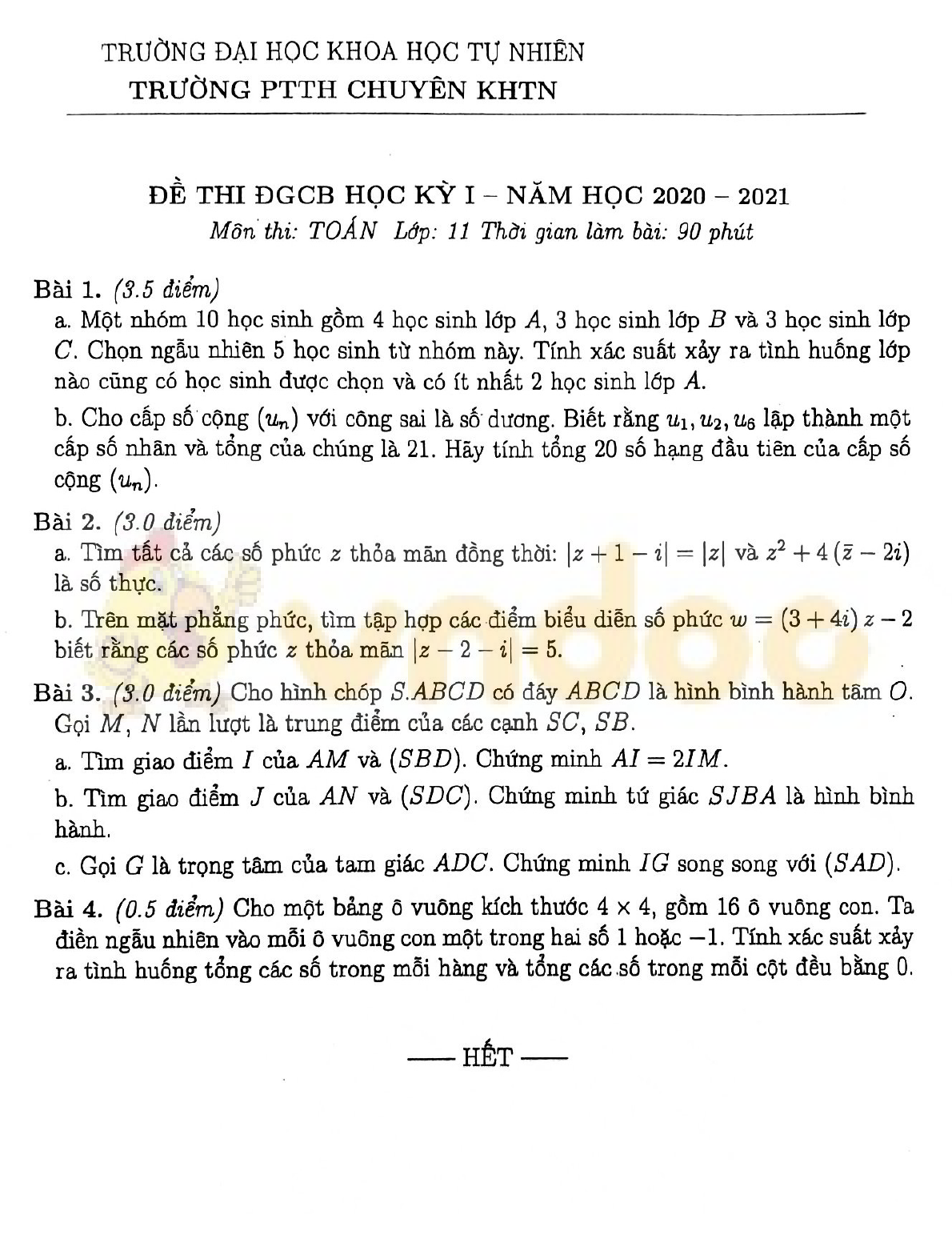 VnDoc.com xin gửi tới bạn đọc bài viết Đề thi đánh giá công bằng học kì 1 lớp 11 môn Toán năm 2020-2021 trường THPT Chuyên KHTN, Hà Nội để bạn đọc cùng tham khảo. Bài viết gồm có 4 câu hỏi tự luận, thí sinh làm bài trong thời gian 90 phút. Mời các bạn cùng tham khảo chi tiết và tải về tại đây nhé.