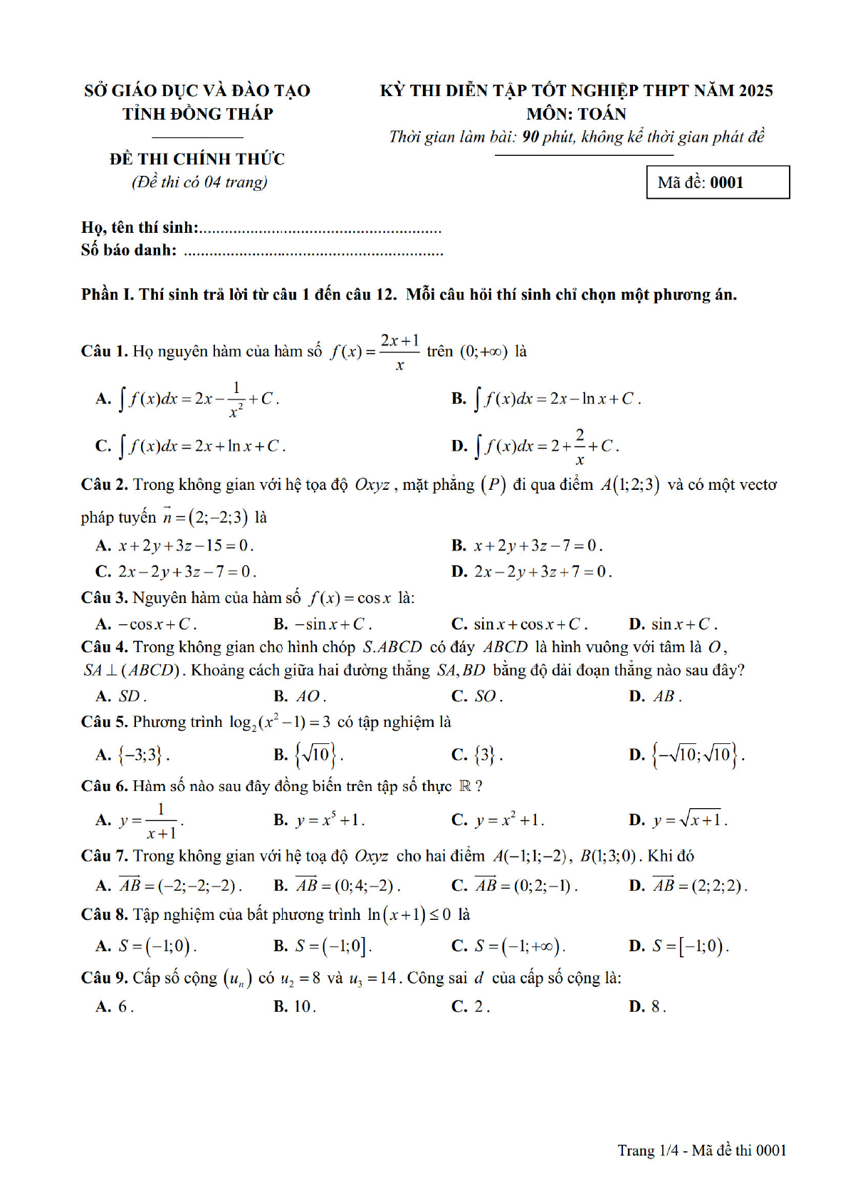 Đề thi diễn tập tốt nghiệp THPT 2025 môn Toán Sở GD&ĐT Đồng Tháp
