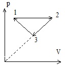 Trên hình vẽ biểu diễn một chu trình biến đổi trạng thái của n mol khí lý tưởng. Chu trình bao gồm hai đoạn thẳng biểu diễn sự phụ thuộc của áp suất p vào thể tích V và một đường đẳng áp. Trên đường đẳng áp 1-2, sau khi thực hiện một công A thì nhiệt độ của nó tăng 4 lần. Nhiệt độ ở các trạng thái 1 và 3 bằng nhau. Các điểm 2 và 3 nằm trên đường thẳng đi qua gốc tọa độ. Hãy xác định nhiệt độ của khí ở trạng thái 1 và công mà khí thực hiện trong chu trình. Áp dụng bằng số: n = 1, A = 9000J.