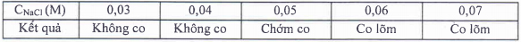 Một học sinh làm thí nghiệm xác định áp suất thẩm thấu của tế bào thực vật. Em cho các tế bào của cùng một mô vào dãy dung dịch NaCl ở 28oC và có nồng độ từ 0,03M đến 0,07M. Quan sát sự co nguyên sinh của tế bào thí nghiệm thu được kết quả như trong bảng sau: