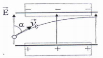 Dùng màn chắn tách ra một chùm hẹp các electron quang điện có vận tốc ban đầu cực đại v0 = 106(m/s) và hướng vào không gian giữa hai bản của một tụ điện phẳng tại điểm O theo phương hợp với vecto cường độ điện trường một góc α = 750. Biết khoảng cách giữa hai bản tụ là d = 10cm, hiệu điện thế giữa hai bản tụ là 2,2V, electron bay ra khỏi tụ điện theo phương song song với hai bản. Bỏ qua tác dụng của trọng lực. Xác định chiều dài của mỗi bản tụ.