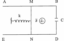 Cho cơ hệ gồm khung dây ABDE hình vẽ, được đặt nằm trên mặt phẳng nằm ngang. Biết lò xo có độ cứng k = 10N/m, đoạn dây MN dài l = 10cm, khối lượng m = 100g tiếp xúc với khung và có thể chuyển động tịnh tiến không ma sát dọc theo khung, tụ điện có điện dung C = 3.10-6F. Hệ thống đặt trong từ trường đều có vecto cảm ứng từ B vuông góc với mặt phẳng của khung, B = 10-4T và có chiều như hình vẽ, kích thích cho MN dao động Chứng miinh thanh MN dao động điều hòa và tính chu kì dao động. Lấy π = 3,14