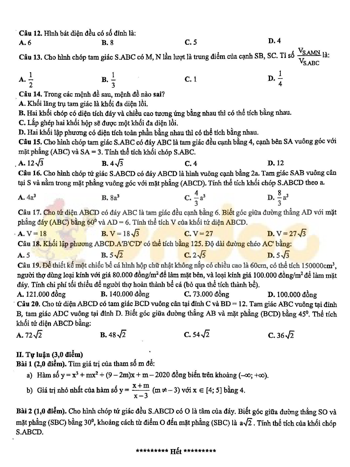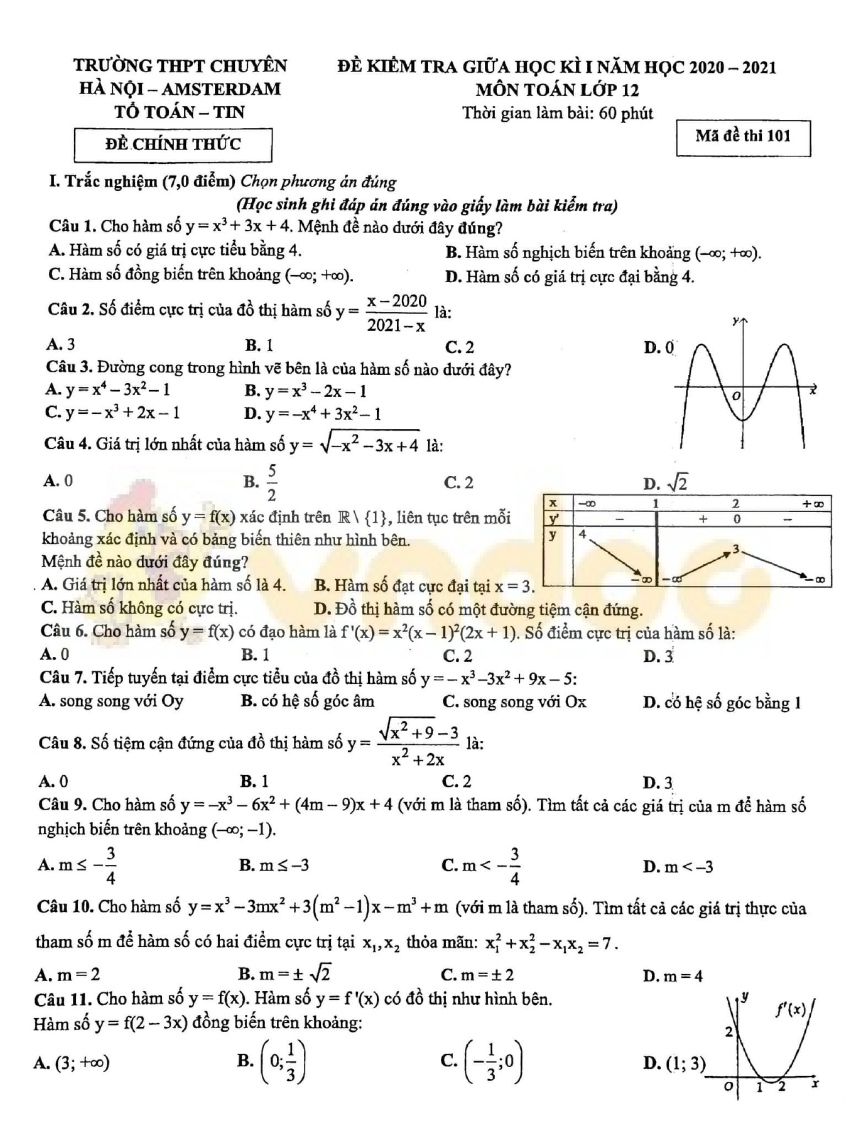 Đề thi giữa học kì 1 lớp 12 môn Toán năm 2020-2021 trường THPT chuyên Hà Nội Amsterdam
