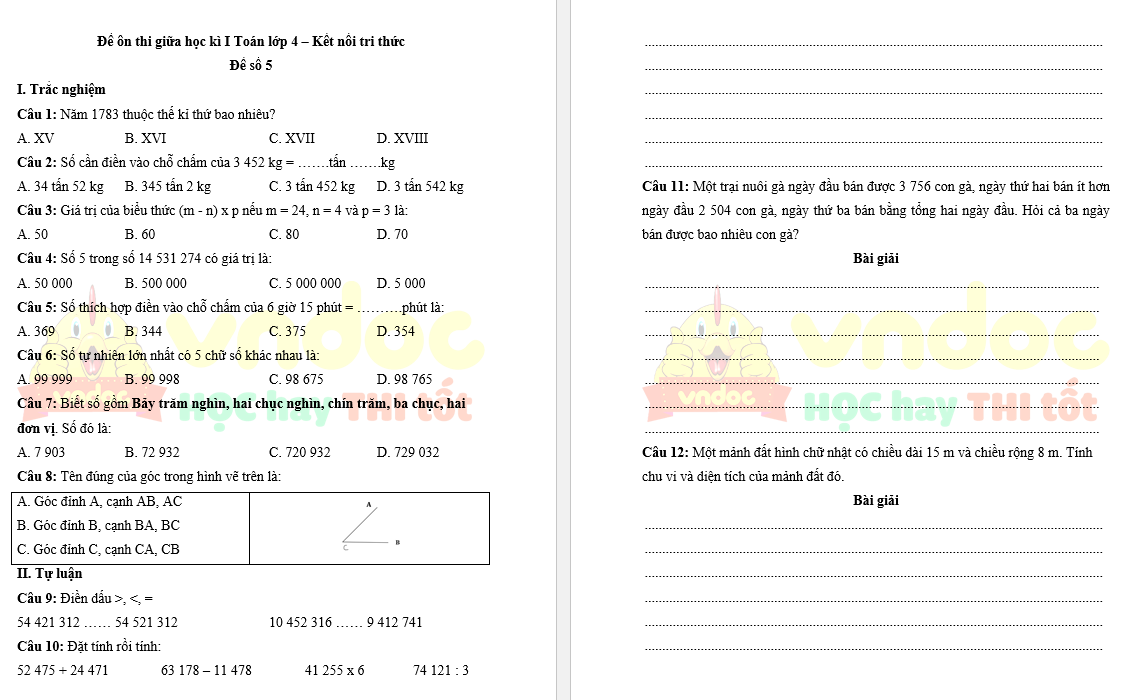 Đề thi giữa kì 1 lớp 4 môn Toán - Đề số 5 sách Kết nối tri thức được biên soạn nhằm giúp các em ôn tập và rèn luyện các kĩ năng làm bài kiểm tra để chuẩn bị cho kì thi giữa học kì 1 lớp 4. Học sinh có thể làm bài trực tiếp vào đề mà không cần chuẩn bị thêm giấy ô li. Mời các em tham khảo tài liệu. Sau đây mời các em cùng tham khảo và tải về để ôn tập thi giữa kì lớp 4 đạt kết quả cao.