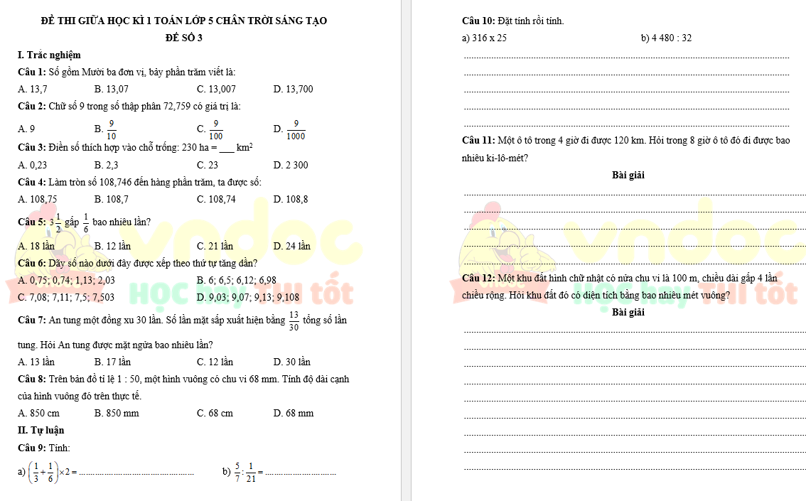 Đề thi giữa kì 1 lớp 5 môn Toán - Đề số 3 sách Chân trời sáng tạo do VnDoc biên soạn nhằm giúp các em ôn tập và rèn luyện các kĩ năng làm bài kiểm tra để chuẩn bị cho kì thi giữa học kì 1 lớp 5. Đề thi gồm các dạng câu hỏi Trắc nghiệm và Bài tập được biên soạn bám sát chương trình học theo thông tư 27. Học sinh có thể làm bài trực tiếp vào đề mà không cần chuẩn bị thêm giấy ô li. Mời các em tham khảo tài liệu.